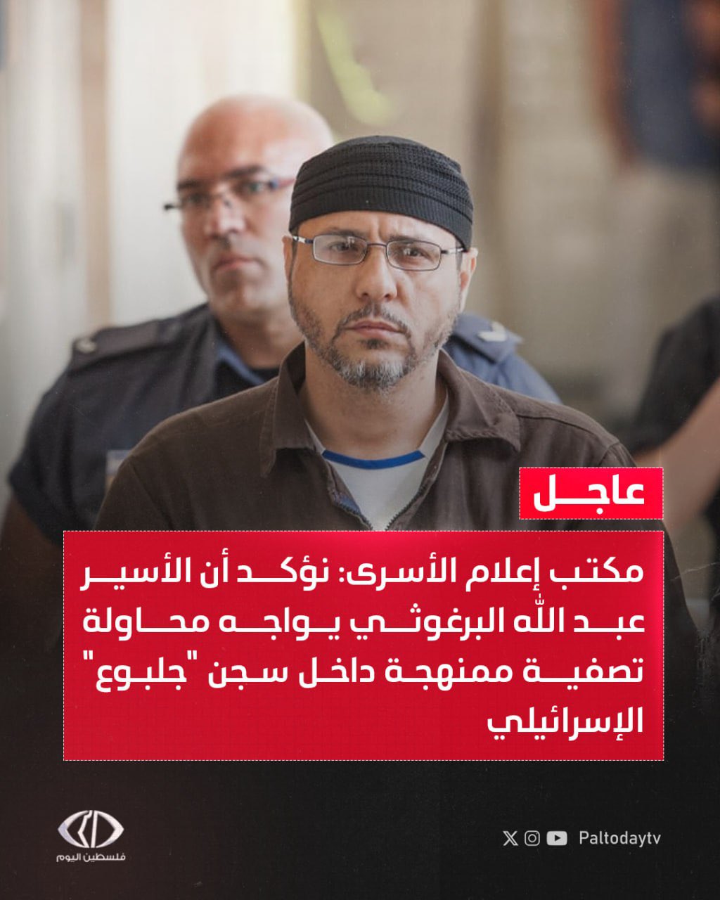 عاجل | مكتب إعلام الأسرى : نؤكد أن الأسير القائد عبد الله البرغوثي يواجه محاولة تصفية ممنهجة داخل سجن "جلبوع" الإسرائيلي حيث وصلت حالته الصحية إلى مرحلة حرجة للغاية تهدد حياته بشكل مباشر #الأسرى