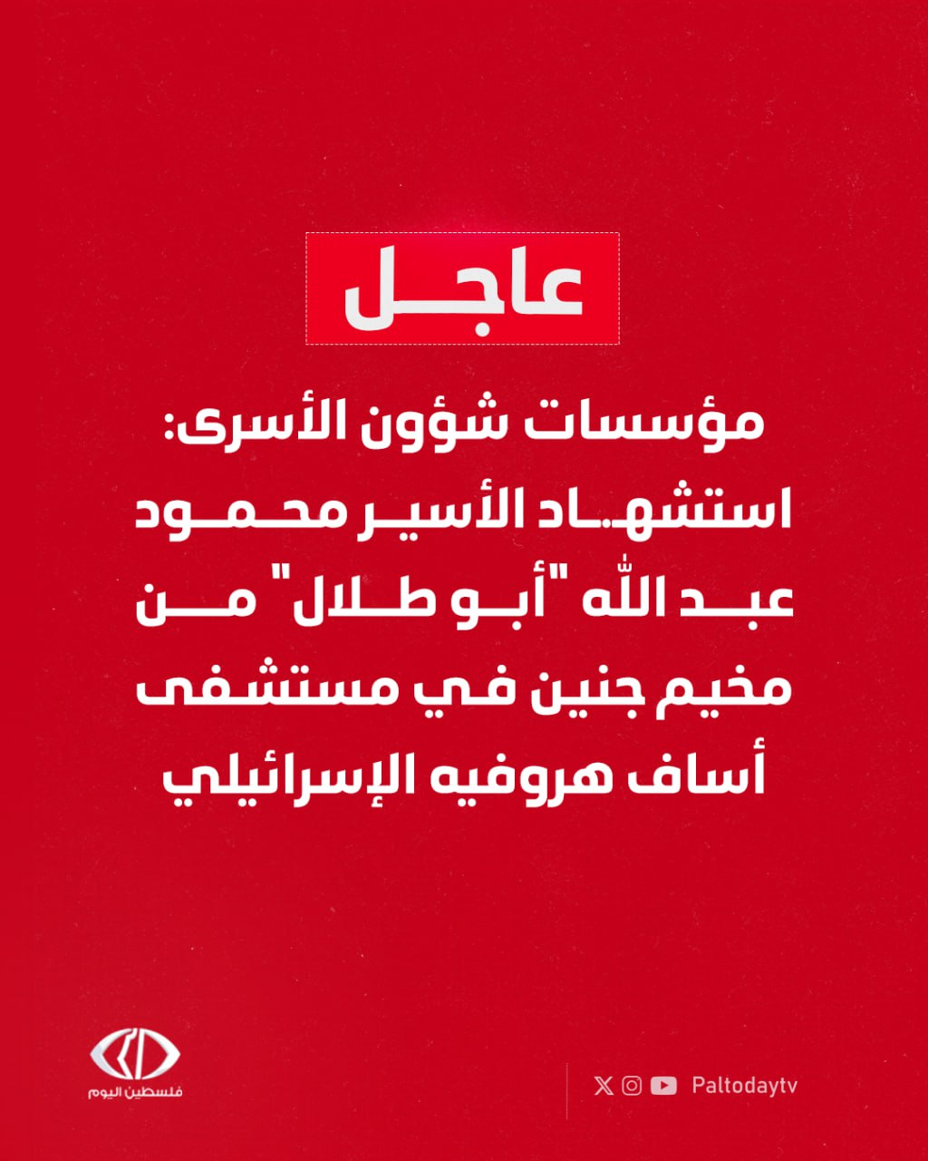 عاجل | مؤسسات شؤون الأسرى: استشهاد الأسير محمود عبد الله "أبو طلال" من مخيم جنين في مستشفى أساف هروفيه الإسرائيلي