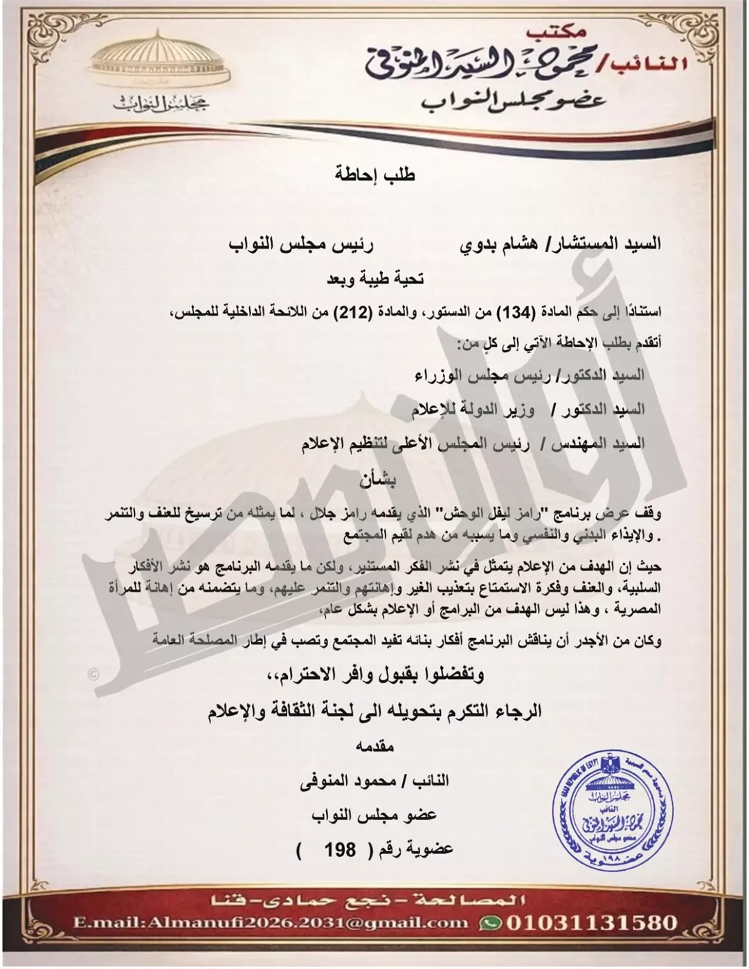 تقدّم النائب محمود السيد المنوفي عضو مجلس النواب، بطلب إحاطة موجه إلى رئيس مجلس الوزراء، ووزير الدولة للإعلام، ورئيس المجلس الأعلى لتنظيم الإعلام، يطالب فيه بوقف عرض برنامج "رامز ليفل الوحش" الي يقدمه الفنان رامز جلال على شاشة MBC مصر.